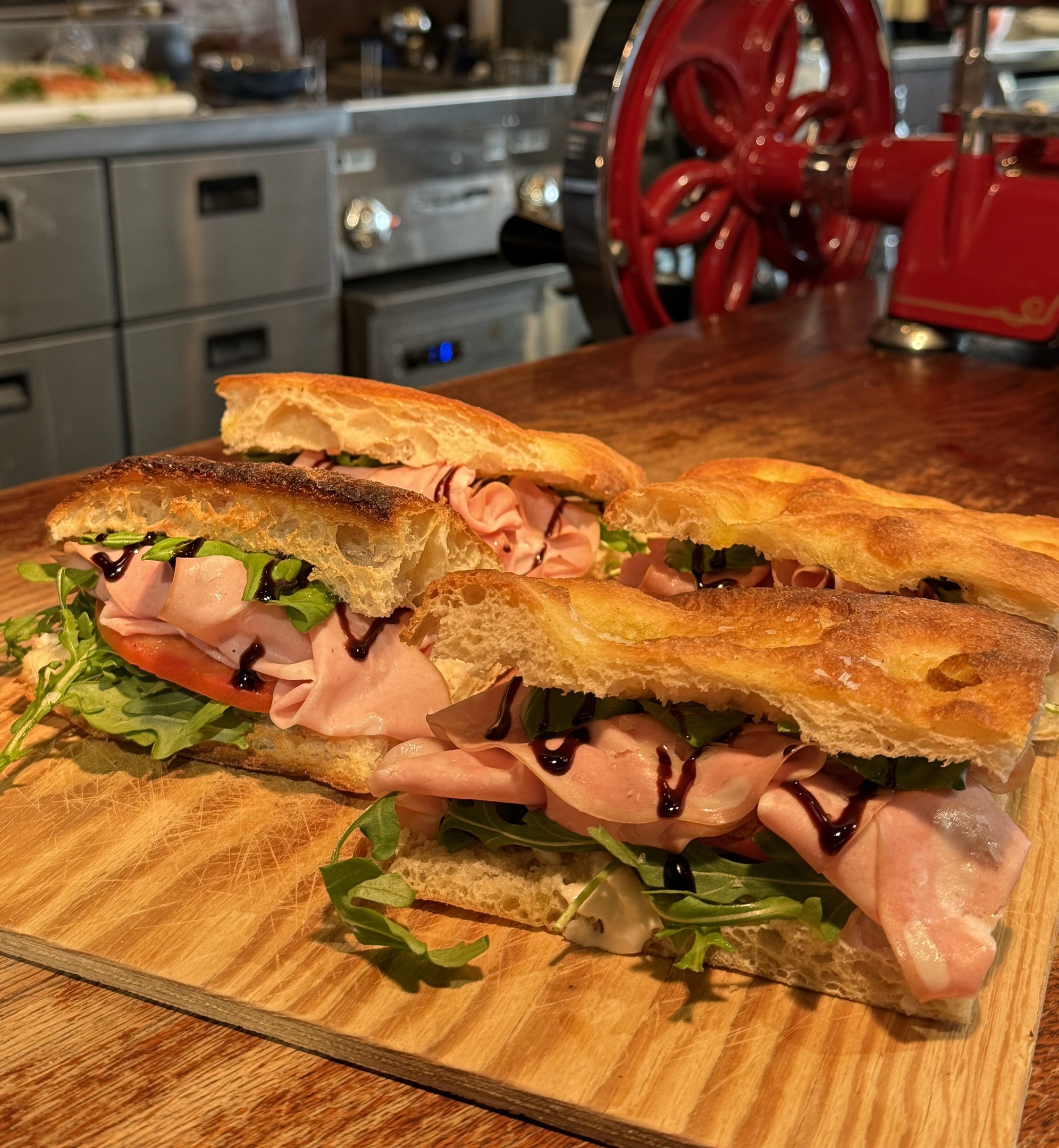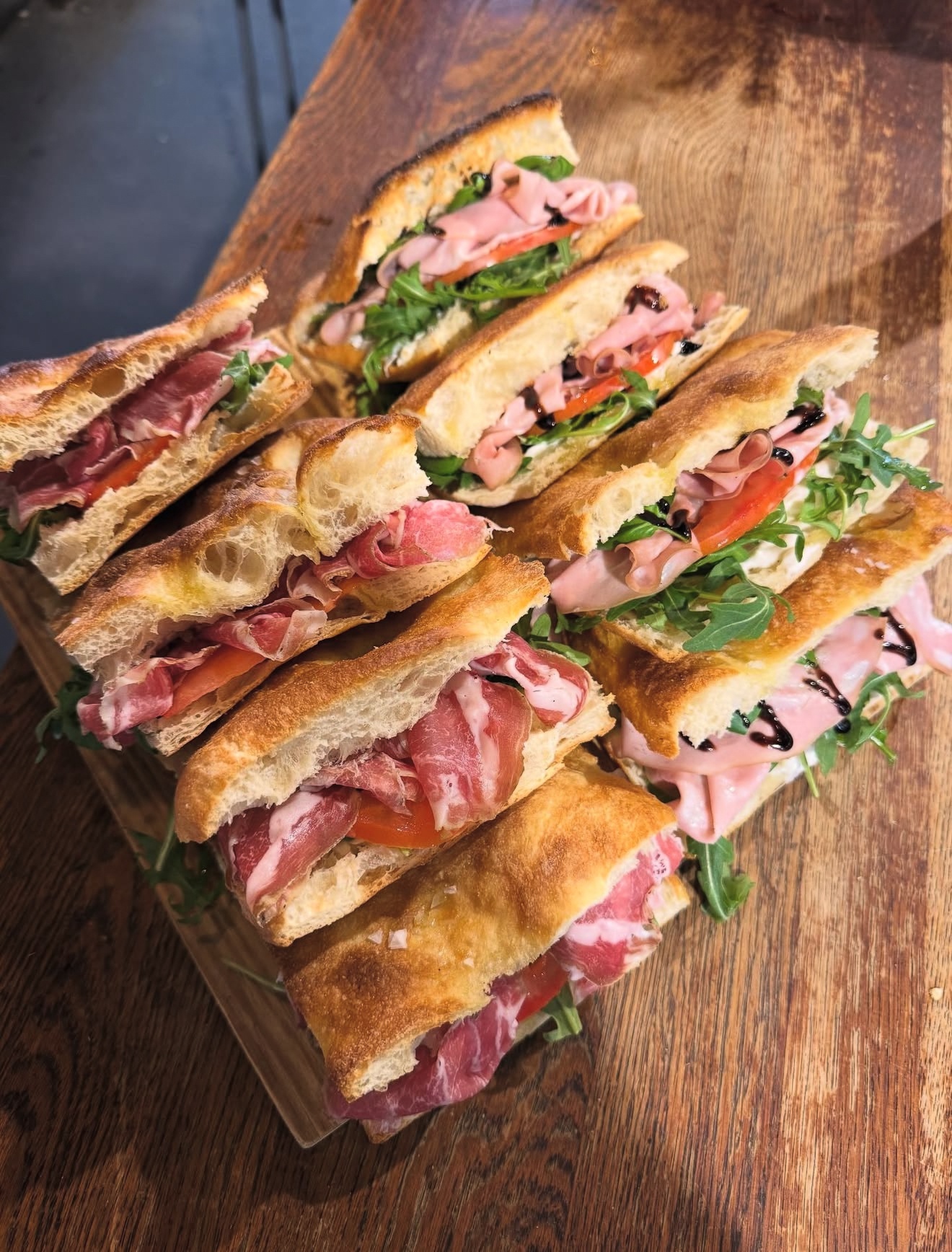 Italienskt surdegsbröd med olika fyllningar. Varierar från dag till dag.