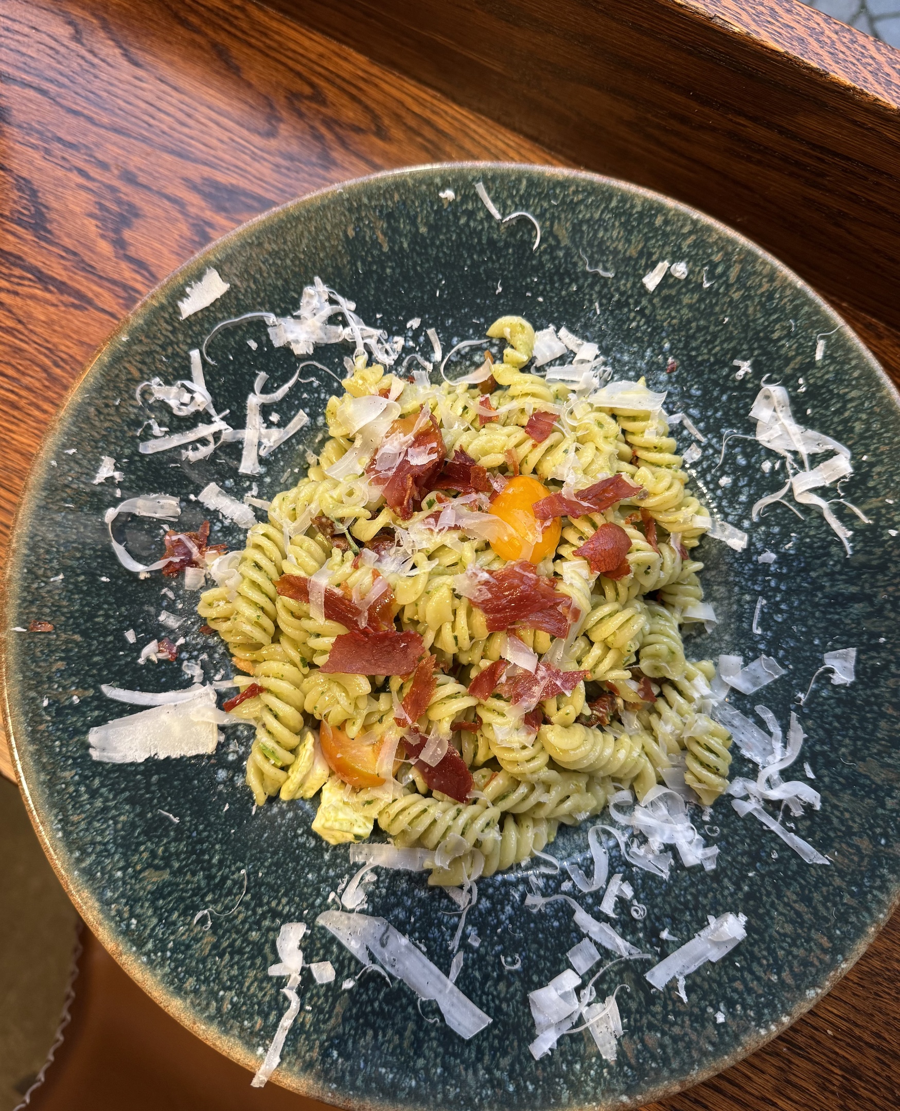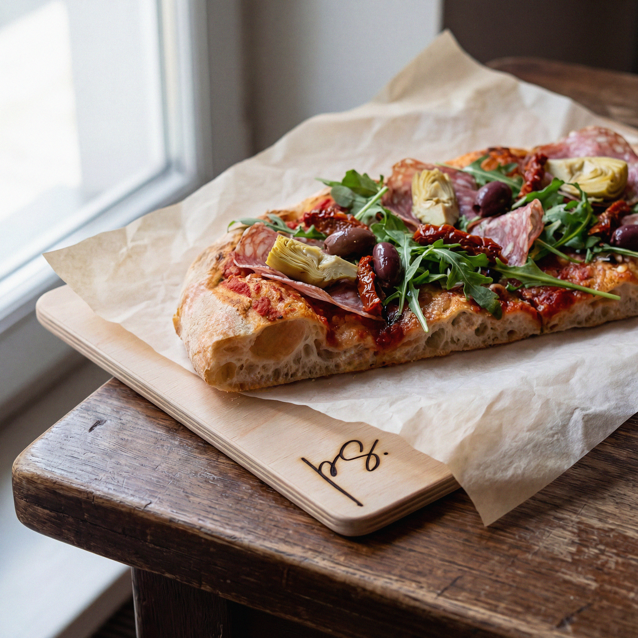 Surdegspizza toppad med säsongens råvaror. Varierar från dag till dag.